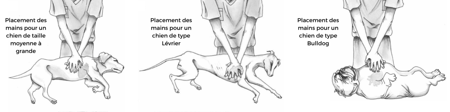 Pour les chiens au thorax large type bulldog, l’animal est mis en décubitus dorsal et les compressions s’effectuent sur le sternum en regard du cœur.